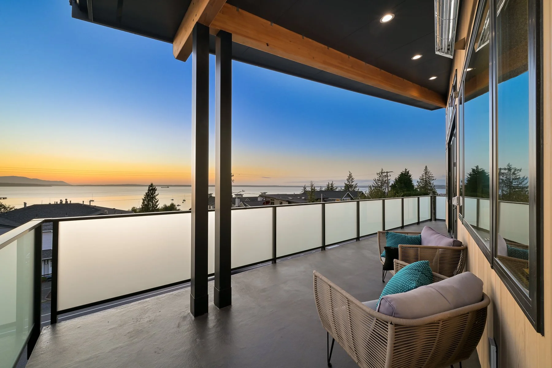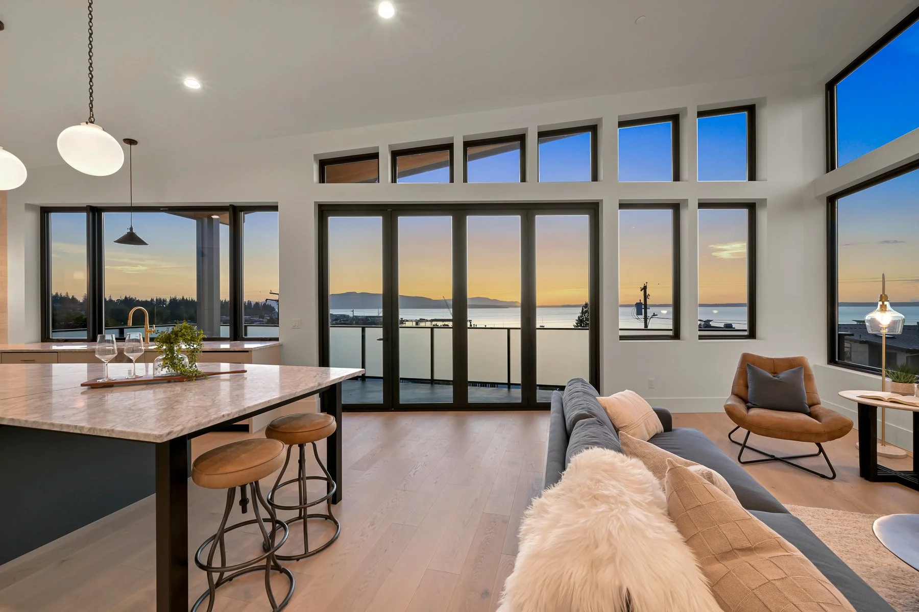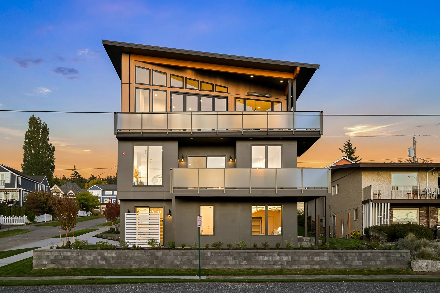 Situated with a prime view of Bellingham Bay, this two-unit condo building was designed to maximize the west facing views. The penthouse unit features large glass doors and a unique canted wall while the lower unit features a large living area with three bedrooms. Designed with timeless, modern materials.
